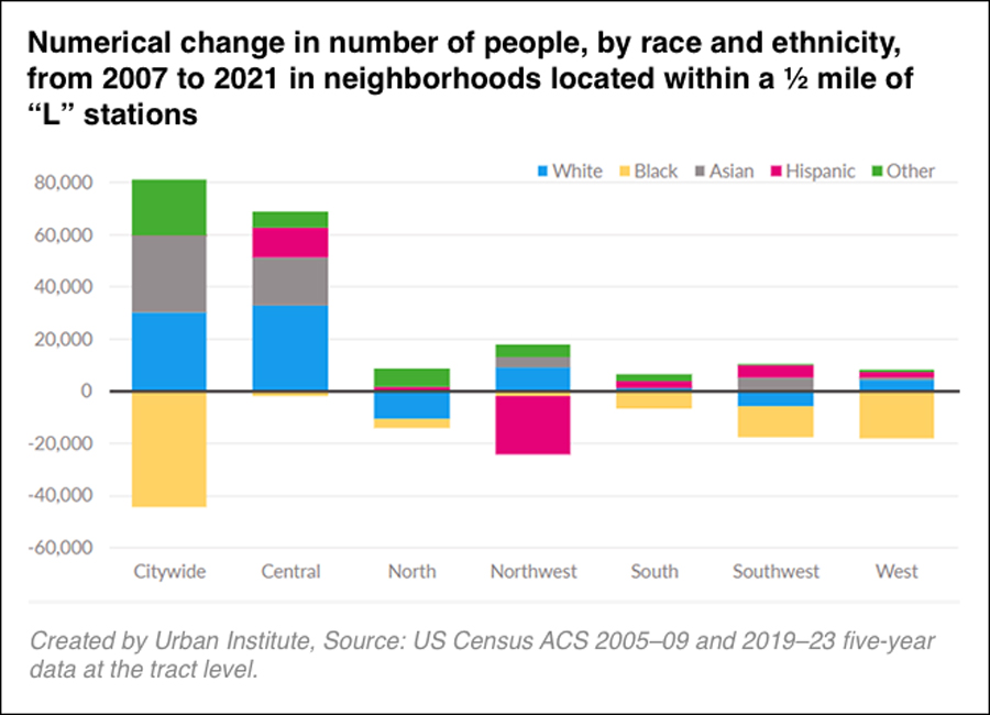 At the same time, there was a decline in the number of Black residents near rail transit stations across the city. The Latinx population remained relatively stable near stations, though there was a large decrease in Latinx population near transit on the Northwest side, which includes communities along the ‘L’ in Logan Square, Avondale, Irving Park, and Jefferson Park.