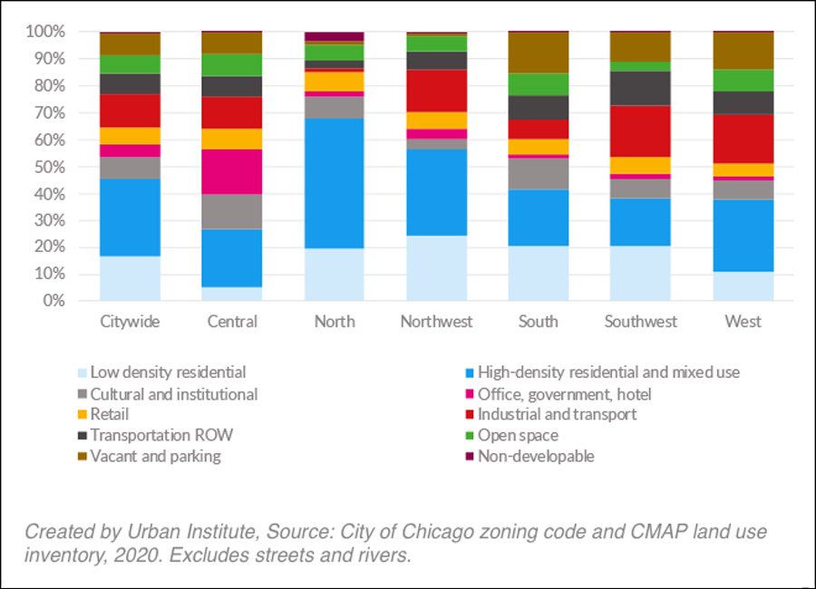 Zoning dictates the kind of development that can be built in the future, but doesn’t always represent current land use, because zoning changes over time. Low density, single family development is a much smaller proportion of the land area near the ‘L’ than the share of land area that is now zoned for low density residential development, indicating there is a mismatch between what the zoning code allows and the land-use patterns of the neighborhoods people actually inhabit. For example, in Figure 6 in the chart on the left, 27 percent of the North side is zoned for low density residential, but looking at the chart on the right, less than 20 percent of the actual land use in the North side is low density residential.