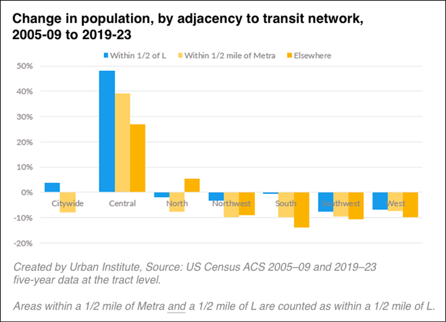 Which places and people have access to transit in Chicago, and how are the areas nearest to transit changing over time?