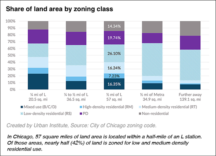 Mixed-use and high-density zoning are both more common within a half-mile of transit stations than further away. Nevertheless, most land near ‘L’ and Metra stations is zoned for low density residential use. This policy limits how many people can live near transit stations.