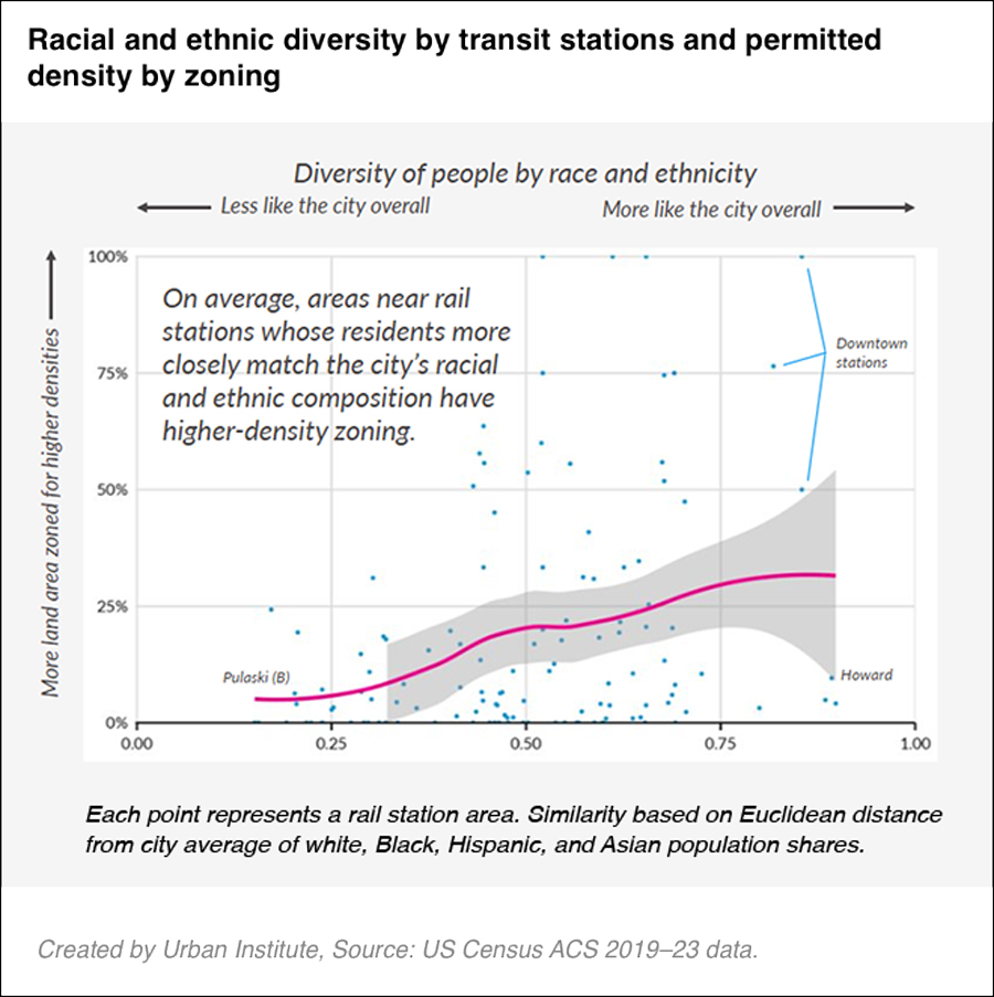 This research suggests that high density zoning near transit is linked with higher levels of racial diversity. On average, higher-density zoning near transit is more common in areas with racial diversity that matches the city (Figure 7).