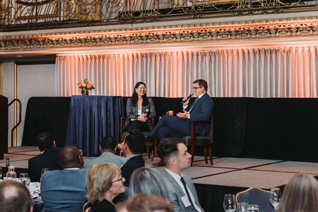 After Christy received her award, the program went into a fireside chat that featured Special Guest Facilitator and Emmy Award-winning host Chris Hayes (MSNBC) in conversation with keynote speaker Ai-jen Poo (The National Domestic Workers Alliance and Caring Across Generations). Chris guided the discussion with his signature depth and curiosity, framing the moment as one of both uncertainty and opportunity. In her responses and remarks, Ai-jen brought her deep expertise in the care economy to the stage, challenging attendees to think about the structural shifts needed to build a more humane and equitable future. Ai-jen underscored the critical nature of both effort and enthusiasm in shaping our shared present and future. Ai-jen framed her remarks by highlighting potential future “worlds” that could emerge depending on the choices leaders make today, each requiring different kinds of action and collaboration.